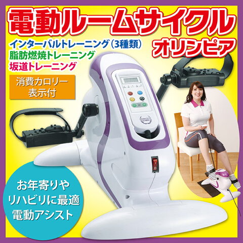 お年寄りやリハビリに最適“電動アシスト” 電動ルームサイクル オリンピア ●インターバルトレーニング(3種類) ●脂肪燃焼トレーニング ●坂道トレーニング ●消費カロリー表示付 お年寄りやリハビリに最適、電動アシストルームサイクル 椅子に座って、床に寝転んで、12段階にスピード調整可能で、 自分のペースに合わせた運動ができます。